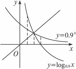 ∴A正确.y=log0.9x与y=0.9x互为反函数,关于y=x对称,由示意图,知log0.90.3>0.90.9,∴B正确.∵0<a<1,∴0<1-a<1,1+a>1,0<1-a2<1.∴loga(1-a)>0,loga(1+a)<0.若|loga(1-a)|<|loga(1+a)|,则loga(1-a)<-loga(1+a),loga(1-a)+loga(1+a)=loga(1-a2)<0,显然错误,∴C不正确.若aabb>abba,则