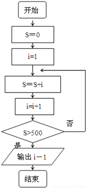 【答案】分析:(1)分析题目中的要求,发现这是一个累加型的问题,故可能用循环结构来实现,在编写算法的过程中要注意,累加的初始值为1,累加值每一次增加1,退出循环的条件是累加结果>500,即可得到流程图;