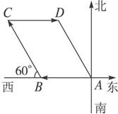 热带风暴“麦莎”从A点出发向西行驶了150公里到达B点,然后又改变方向向西北60°走了200公里到达C点,最后又改变方向,向东行驶了150公里到达D点.(1)作出向量