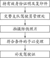一切工作补领驾驶证要经历以下过程:首先持有效身份证明及复印件到交警支队驾驶员管理处,然后拍摄防伪照片,符合条件的予以受理,可以补发驾驶证,设计一个流程图表示这一过程.