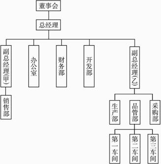 (3)副总甲负责销售部,副总乙负责生产部、品管部、采购部,而品管部又下设三个车间.试绘出该公司组织结构图.