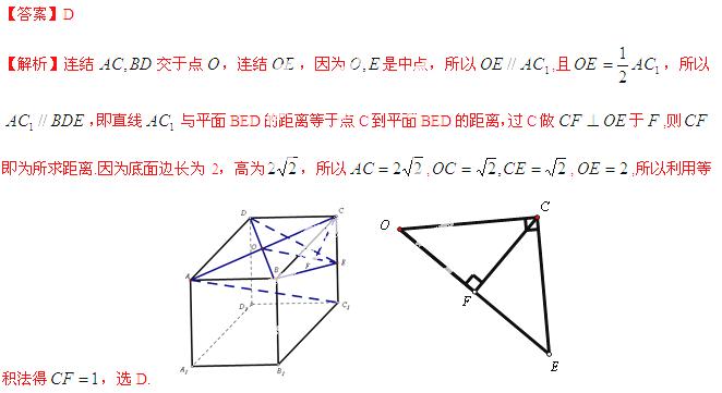 已知正四棱柱中 ,,,为的中点,则直线与平面的距离为( )