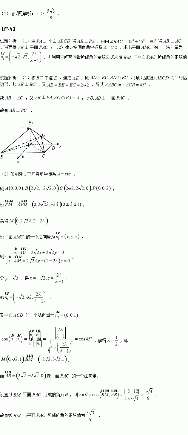 (2)若二面角的大小为45°,求与平面所成角的正弦值.
