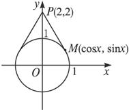 解法二:令x1=cosx,y1=sinx,有x12+y12=1.它表示单位圆,则所给函数y就是经过定点P(2,2)以及该圆上的动点M(cosx,sinx)的直线PM的斜率k,故只需求此直线的斜率k的最值即可.由