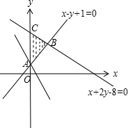 解答 解:由约束条件$\left\{\begin{array}{l}x-y+1≤0\\ x+2y-8≤0\\ x≥0\end{array}\right.$作出可行域如图,![]()
