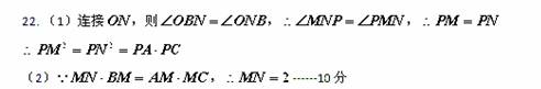 如图,圆O的半径OB垂直于直径AC,M为OA上一点,BM的延长线交圆O于N,过N点的切线交CA的延长线于P。(1)求证: ;(2)若圆O的半径,OA=OM,求MN的长。