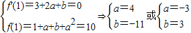 【答案】分析:(1)先对函数求导f'(x)=3x2+2ax+b,由题意可得f(1)=10,f′(1)=0,结合导数存在的条件可求