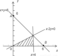【答案】分析:根据线性规划的知识画出Ω={(x,y)|x+y≤6,x≥0,y≥0}与A={(x,y)|x≤4,y≥0,x-2y≥0}表示的区域,利用面积之比求出答案即可.