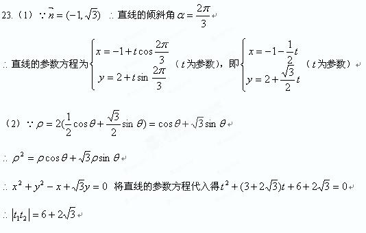已知直线是过点,直线的倾斜角为120o,圆方程;(1)求直线的参数方程;(2)设直线与圆相交于两点,求的值。