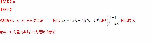 设,为基底向量,已知向量=– k, = 2+,= 3–,若A,B,D三点共线,则实数k的值等于( )