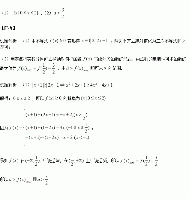 (本小题满分12分)已知函数= | x +1|?|2x?1|。