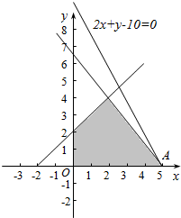 解:不等式组$\left\{\begin{array}{l}{x≥0}\\{y≥0}\\{x-y≥-2}\\{4x+3y≤20}\end{array}\right.$以及2x+y-10=0表示的可行域与直线如图:显然在与可行域只有一个交点A(5,0).