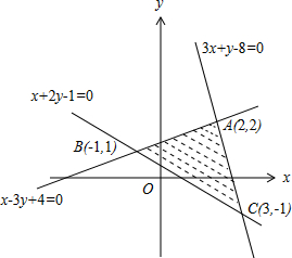 解答 解:由约束条件$\left\{\begin{array}{l}{x-3y+4≥0}\\{x+2y-1≥0}\\{3x+y-8≤0}\end{array}\right.$作出可行域如图,![]()