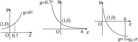 提示:把三个数看成函数y=6x,y=0.7x,y=log0.7x的自变量分别取x=0.7,x=6,x=6时的函数值,利用图象得60.7>1,0<0.76<1,log0.76<0,故log0.76<0.76<60.7.∴故选D. 答案:D