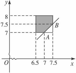 设送报人到达的时间为x,父亲离开的时间为y,则x∈[6.5,7.5],y∈[7,8],能取到报纸的条件是x≤y,作直线y=x,得交点A(7,7),B(7.5,7.5).