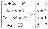 为确保信息安全,信息需加密传输,发送方由明文→密文(加密),接收方由密文→明文(解密),已知加密规则为:明文a,b,c,d对应密文a+2b,2b+c,2c+3d,4d,例如,明文1,2,3,4对应密文5,7,18,16.当接收方收到密文14,9,23,28时,则解密得到的明文为( )
