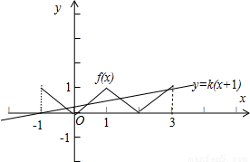 【答案】分析:由f(x+1)=1-f(x)可得函数f(x+2)=f(x),故函数f(x)是以2为周期的周期函数.由题意可得函数y=f(x)的图象与直线y=k(x+1)在区间[-1,3]内有4个交点,根据奇偶性和周期性作出f(x)、y=k(x+1)的图象,数形结合可得实数k的取值范围.