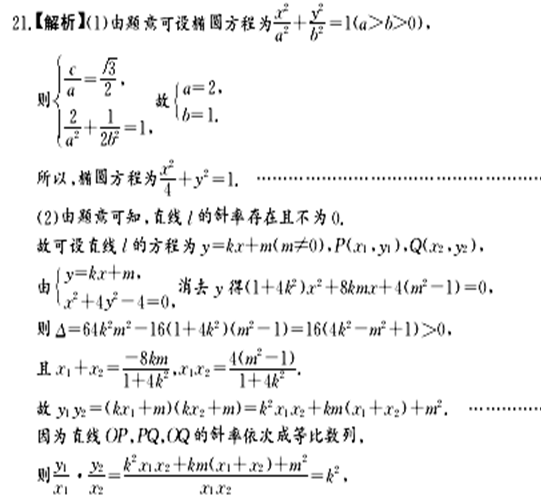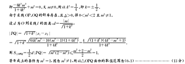 (Ⅱ)设不过原点O的直线l与该椭圆交于P,Q两点.满足直线OP,PQ,OQ的斜率依次成等比数列,求△OPQ面积的取值范围。