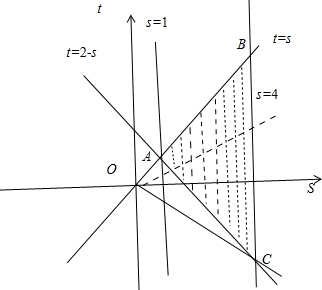 分析:首先由由f(x-1)的图象关于(1,0)中心对称知f(x)的图象关于(0,0)中心对称,根据奇函数定义与减函数性质得出s与t的关系式,然后利用线性规划的知识即可求得结果.