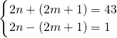 注意到43是质数,且2n+(2m+1)>2n-(2m+1),2n+(2m+1)>0,