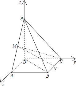 分析 (1)首先以DA,DC,DP三直线分别为x,y,z轴,建立空间直角坐标系,写出图形中点的坐标,根据已知$\overrightarrow{DA}$为平面PCD的一条法向量,要证明MN∥平面PCD,只要证明$\overrightarrow{MN}⊥\overrightarrow{DA}$,即求$\overrightarrow{MN}•\overrightarrow{DA}=0$即可;