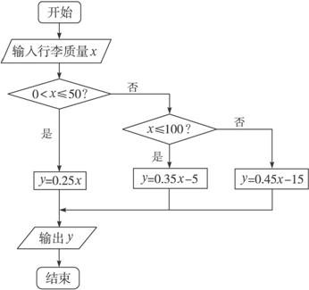 乘坐火车时,可以托运货物.从甲地到乙地,规定每张火车客票托运费计算方法是:行李质量不超过50 kg时按0.25元/kg;超过50 kg而不超过100 kg时,其超过部分按0.35元/kg;超过100 kg时,其超过部分按0.45元/kg.编写程序,输入行李质量,计算出托运的费用.