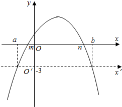10.函数f(x)=(a-x)(x-b)-3,m,n是方程f(x)=0的两个实根,其中,a<b,m<n,求a,b,m,n的大小关系.分析 如图所示,在直角坐标系x′O′y中,画出y=(a-x)(x-b)的图象,再将x′轴向上平移3个单位即可得出:函数f(x)=(a-x)(x-b)-3的图象,数形结合可得答案.