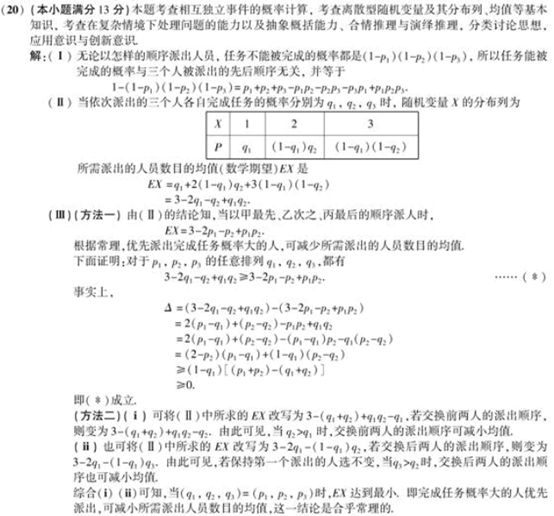 (Ⅰ)如果按甲在先,乙次之,丙最后的顺序派人,求任务能被完成的概率。若改变三个人被派出的先后顺序,任务能被完成的概率是否发生变化?