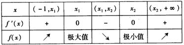 因此f(x)在区间(-1,x1)和(x2,+∞)内是增函数,在区间(x1,x2)是减函数。
