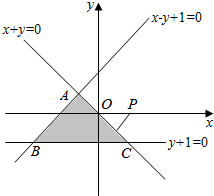 解答 解:由约束条件$\left\{\begin{array}{l}{y+1≥0}\\{x-y+1≥0}\\{x+y≤0}\end{array}\right.$作出可行域如图,![]()