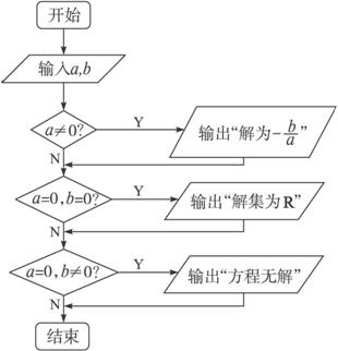 第三步,判断a=0,b≠0是否同时成立.若成立,输出结果“方程无解”,结束算法.