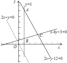 解:根据约束条件$\left\{\begin{array}{l}{x-4y+3≤0}\\{2x+y-12≤0}\\{x≥1}\end{array}\right.$,画出可行域,如图所示;