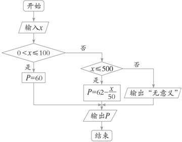 某服装厂生产一种服装,每件服装的成本为40元,出厂单价为60元.该厂为鼓励销售商订购,决定当一次定购量超过100件时,每多订购一件,订购的全部服装的出厂单价就降低0.02元.根据市场调查,销售商一次订购量不会超过500件.设一次订购量为x件,服装的实际出厂单价为P元,写出函数P=f(x)的表达式,并作出程序框图.