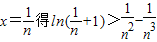 即当x∈(0,+∞)时,有x3-x2+ln(x+1)>0,ln(x+1)>x2-x3,对任意正整数n,取