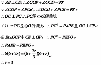 (1)求证:PC是⊙O切线。(2)若OE:EA=1:2,PA=6,求⊙O的半径