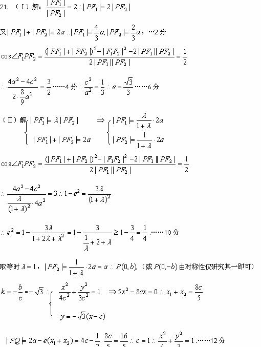 (II)当椭圆离心率最小时,PQ为过椭圆右焦点F2的弦,且,求椭圆的方程。