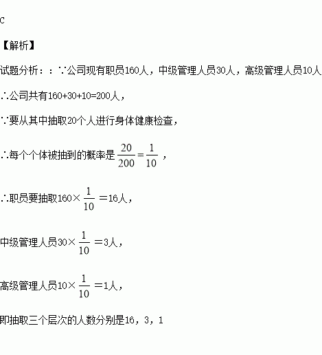 某公司现有职员160人,中级管理人员30人,高级管理人员10人,要从其中抽取20个人进行身体健康检查,如果采用分层抽样的方法,则职员、中级管理人员和高级管理人员各应该抽取多少人