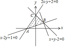 解答 解:由约束条件$\left\{\begin{array}{l}{x+y-2≤0}\\{x-2y+1≤0}\\{2x-y+2≥0}\end{array}\right.$作出可行域如图,![]()