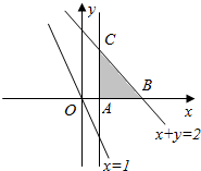 解答 解:由约束条件$\left\{\begin{array}{l}{x≥1}\\{y≥0}\\{x+y≤2}\end{array}\right.$作出可行域如图,![]()