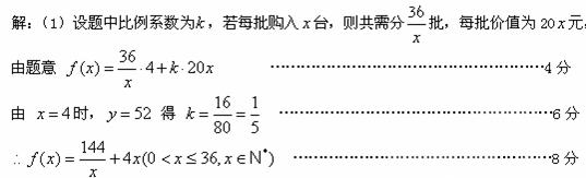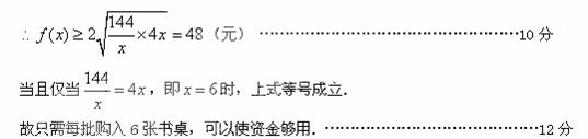 在一个月内分批购入每张价值为20元的书桌共36台,每批都购入x台(x是正整数),且每批均需付运费4元,储存购入的书桌一个月所付的保管费与每批购入书桌的总价值(不含运费)成正比,若每批购入4台,则该月需用去运费和保管费共52元,现在全月只有48元资金可以用于支付运费和保管费.