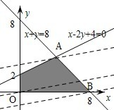 分析:先根据条件画出可行域,设z=5y-x,再利用几何意义求最值,将最小值转化为y轴上的截距最大,只需求出直线,过可行域内的点B(8,0)时的最小值,过点A(4,4)时,5y-x最大,从而得到a-b的值.