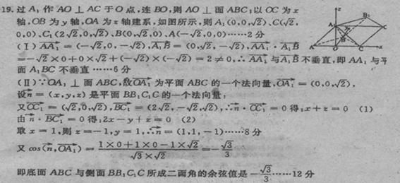 (Ⅱ)求底面ABC与侧面BB1C1C所成二面角的余弦值。