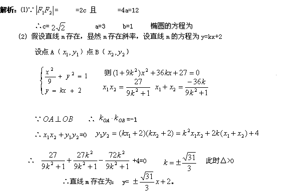 ⑵是否存在直线m过点P(0,2),与⑴中的椭圆C交于A、B两点,且以AB为直径的圆过