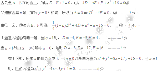 已知过A(0,1)和B(4,a)且与x轴相切的圆只有一个,求a的值及圆的方程.