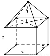 试题分析:还原几何体,得棱长为2的正方体和高为1的正四棱锥构成的简单组合体,如图所示,![]()
