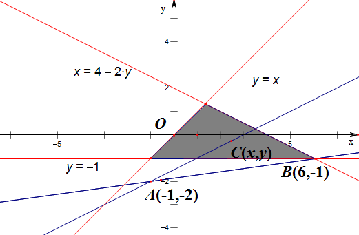 1.已知实数x、y满足$\left\{\begin{array}{l}{y≤x}\\{x+2y≤4}\\{y≥-1}\end{array}\right.$,则$\frac{y+2}{x+1}$的最小值为$\frac{1}{7}$.分析 由题意作平面区域,从而利用$\frac{y+2}{x+1}$的几何意义是点A(-1,-2)与点C(x,y)所在直线的斜率解得.