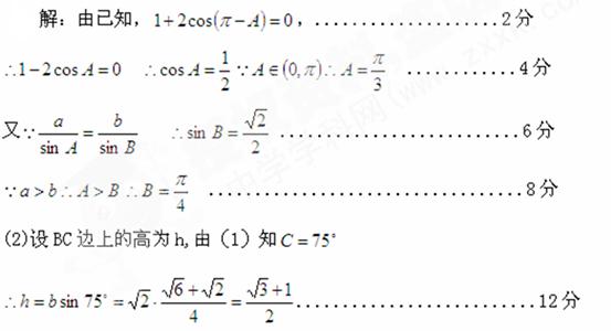 (本小题满分12分)在△ABC中,已知,,, 求(1)角A,B ; (2)求BC边上的高。