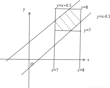 【答案】分析:由题意知本题是一个几何概型,试验包含的所有事件是Ω={(x,y)|7<x<8,7<y<8},做出事件对应的集合表示的面积,写出满足条件的事件是A={(x,y)|7<x<8,7<y<8,|x-y|<