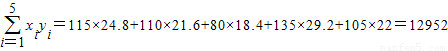 xiyi=115×24.8+110×21.6+80×18.4+135×29.2+105×22=12952)