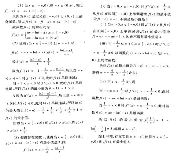 (3)是否存在实数a,使得当x∈[-e,0)时f(x)的最小值是3 如果存在,求出实数a的值;如果不存在,请说明理由.
